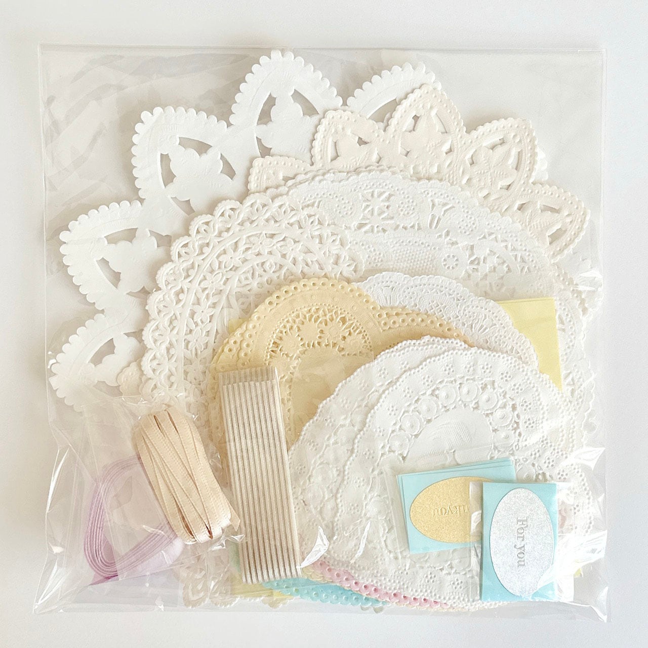 店頭で販売していたレースペーパー・シール・リボンなどのラッピング・デコレーションアイテムをいっぱい袋に詰め込みました。