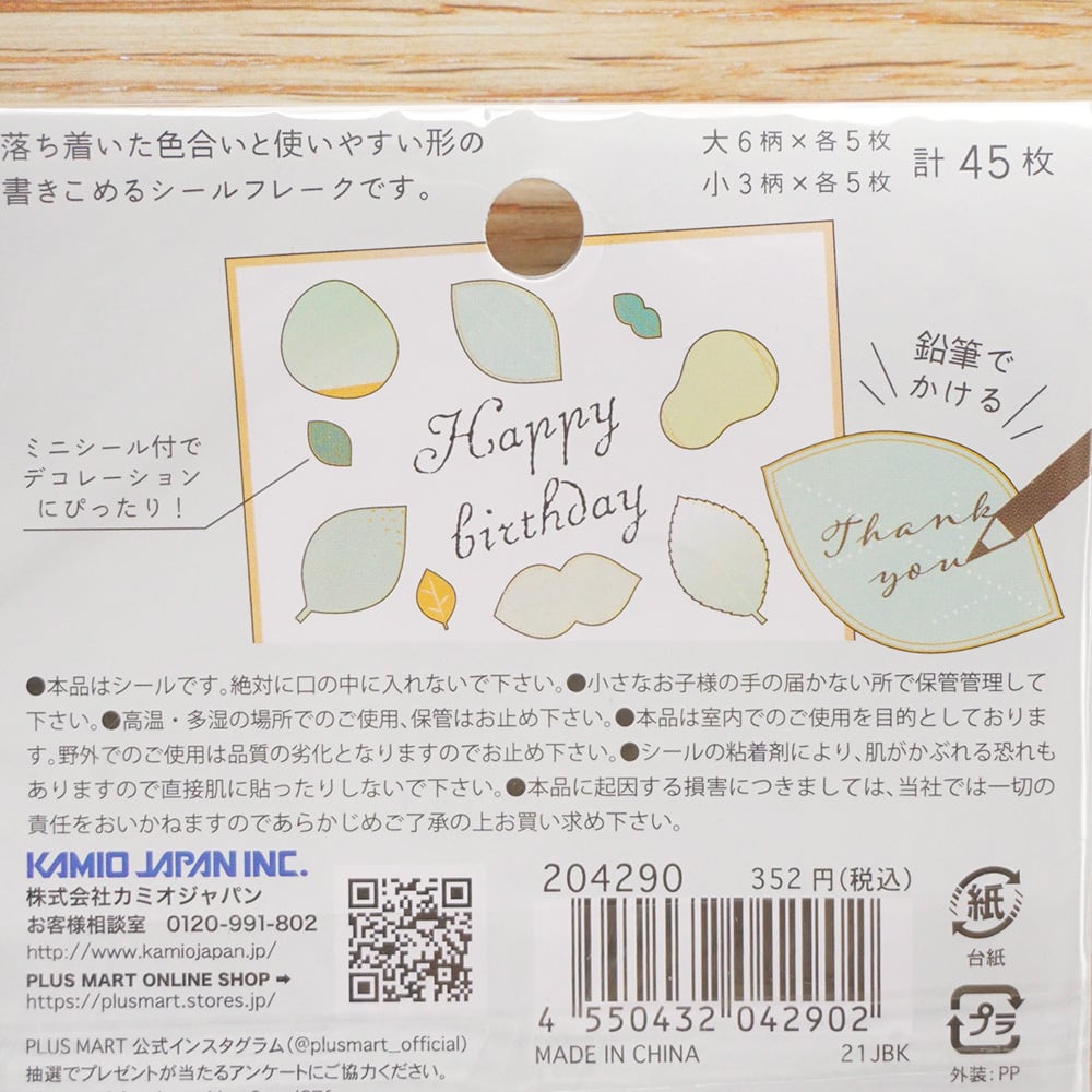 落ち着いた色合いとと使いやすい形形の書き込めるシールフレークです。