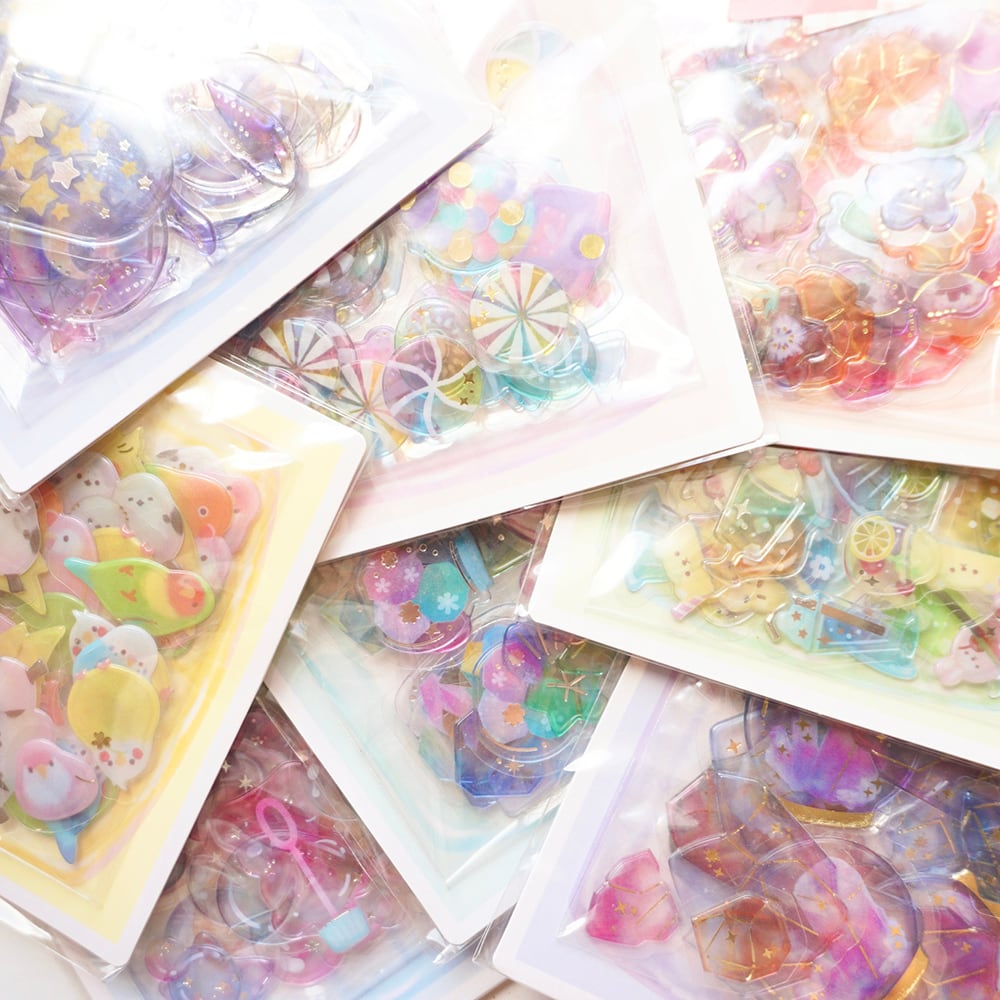金箔or 銀箔押しのキラキラ感と厚みのあるクリア感が特徴のシールです。