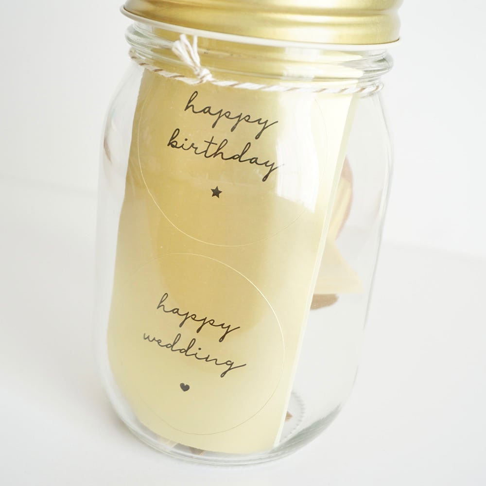 ひとりずつカードにメッセージを書いて、ガラス瓶に入れてプレゼントできる寄せ書きセット。洒落たメッセージの贈り物になります。バースデー、ウェディング、サンキュー、無地の4種類の目的別シール付き。